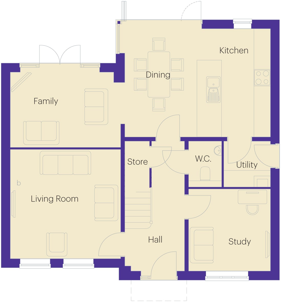The Bywell is a stunning family home which is smart with space. The hall leads to a good sized lounge and study to be used at your leisure, with a convenient WC and storage cupboard also just off the hall. At the rear is an impressive open-plan kitchen/dining/family area spanning the width of the home, which leads to a separate utility area. This bright and airy space features a set of bi-fold and French doors which give access to the rear garden, making it the ultimate space for entertaining family and friends.